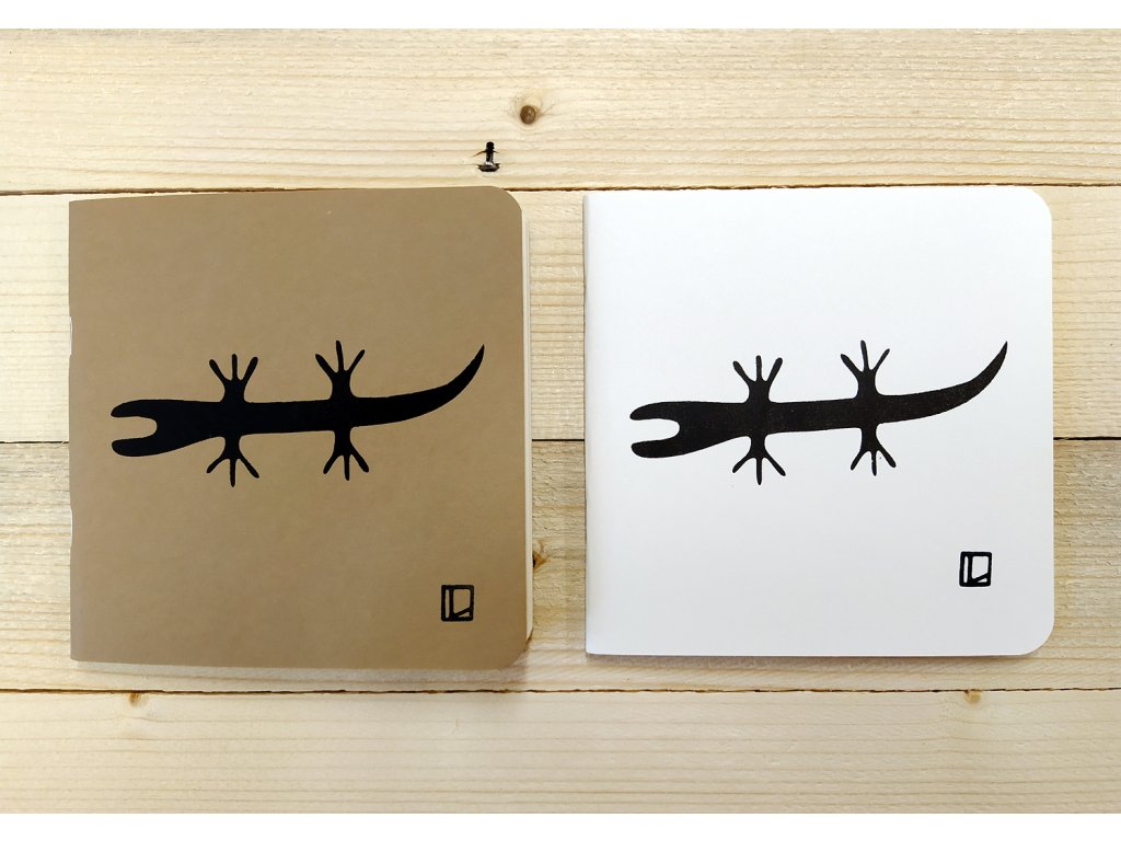 Sešit čtvercového formátu, rozměr 14,5 x 14,5 cm, uvnitř 30 listů z recyklovaného papíru. Desky sešitu tvoří recyklovaný kartonový papír, hnědá barva ladí s černým dekorem "ještěrka". Vyšší gramáž 300 g/m2 zajišťuje pevnost a stálost sešitu. Na obalu (deskách sešitu) je umístěna malá značka / logo pana Lhotského. Zvolit si můžete mezi hnědou či bílou variantou desek sešitu.