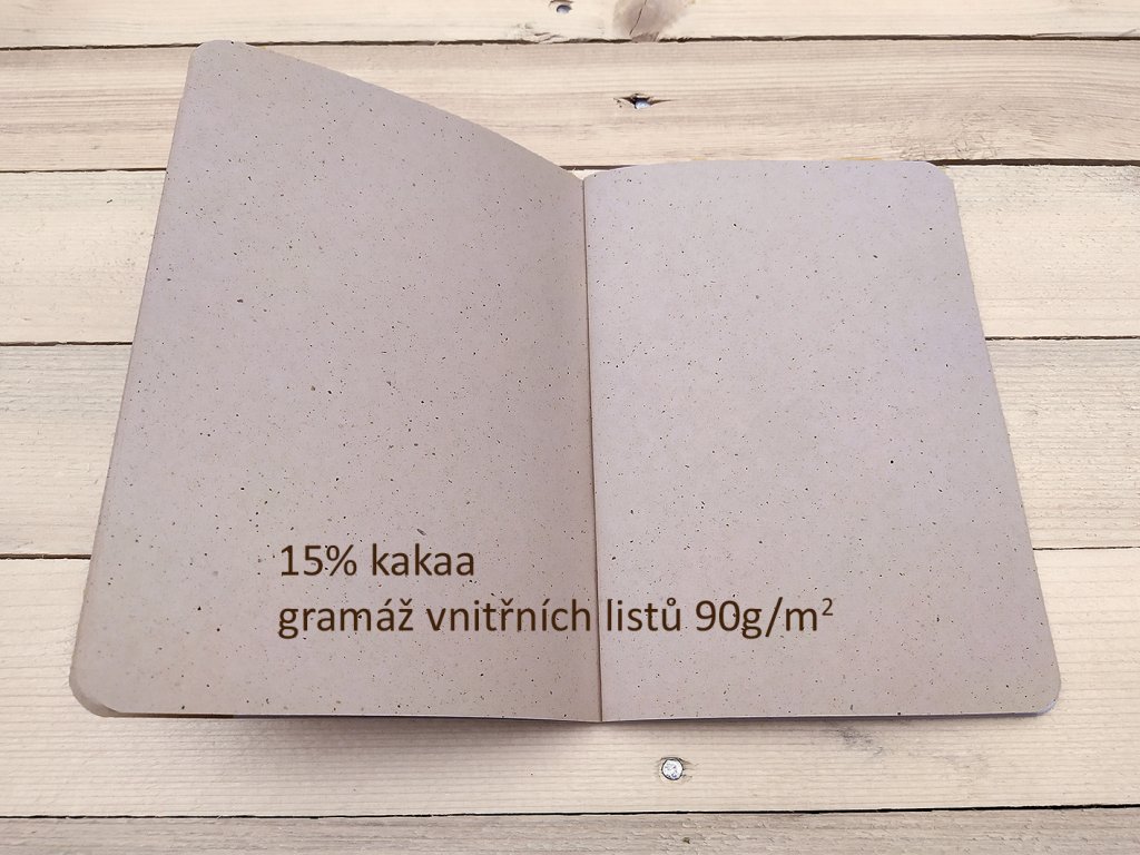 Sešit působí jedinečným dojmem a drobné kousky kakaa definují jeho originální vzhled.