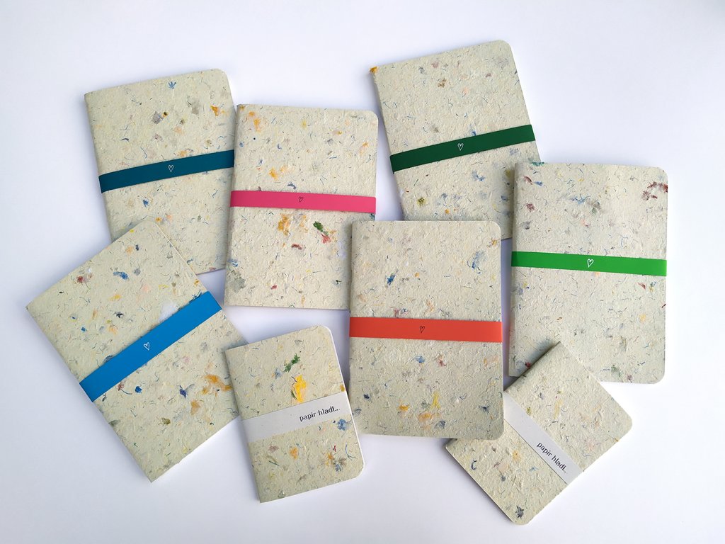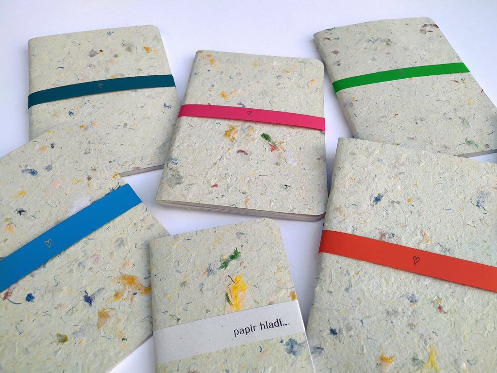 - desky sešitu z ručního papíru z konopí, lnu a modlitebních praporků z budhistického kláštera v Liberci – gramáž cca 300g/m2