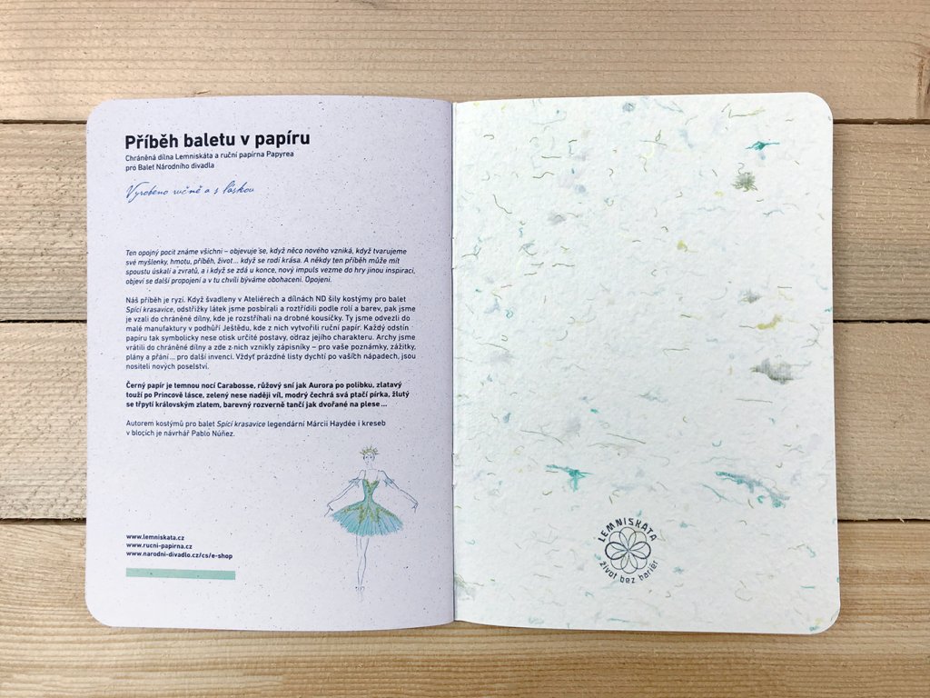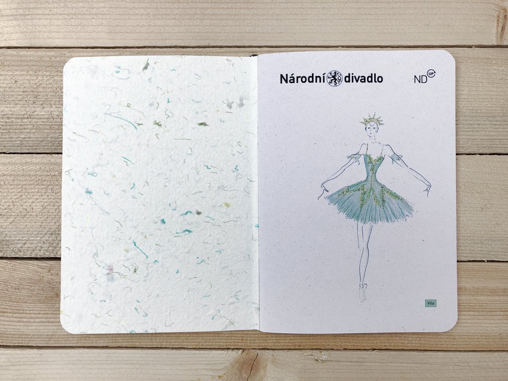 Z odstřižků kostýmů, které pro baletní představení Spící krasavice navrhnul světoznámý návrhář Pablo Núňéz, jsme nechali u přátel z rodinné papírny Papyrea vyrobit něžný a díky textilním zbytkům na omak sametově "teplý" papír a z něj tvoříme krásné sešity.