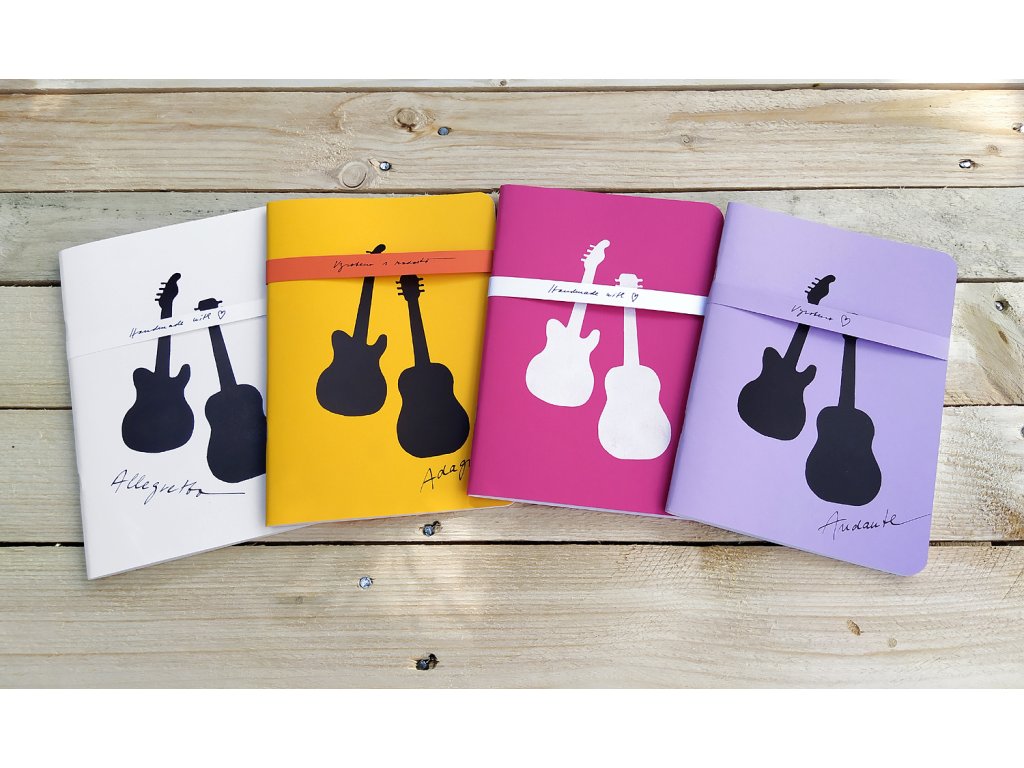 Hudební vzory jsou součástí zdobené řady, kterou ručně "ťupeme" v naší dílně. Jde o techniku, kdy pomocí štětce, akrylových barev a námi vytvořených šablon, přenášíme obraz na sešit. Každý kus je tedy originál.